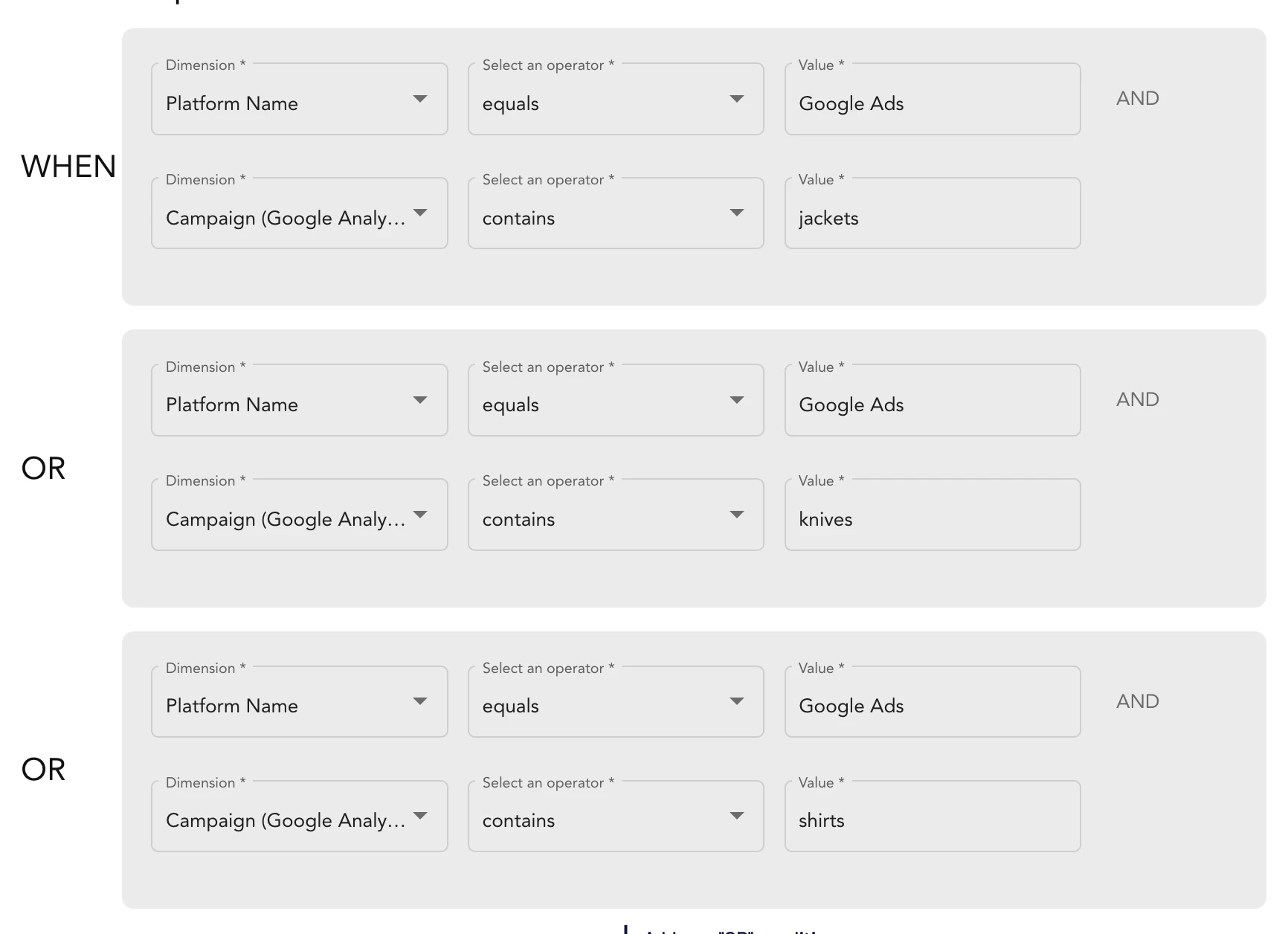 For building custom dimensions in our Roivenue app you create rules using AND/OR conditions. With this feature, you can create complex workflows within a single rule, which makes it easier to manage moving forward.