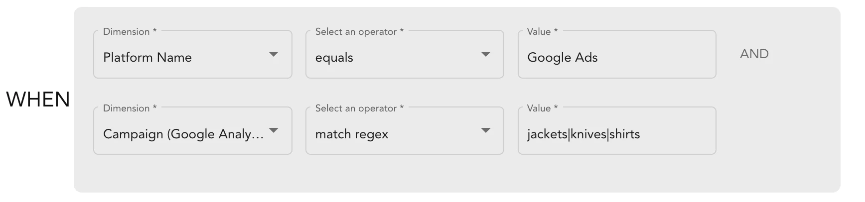 Are you familiar with regexes? Save time by utilizing them! Imagine a scenario where you would like to take a different set of campaigns from Google Ads that contain different keywords. With contains conditions you would have to create multiple OR conditions like this: